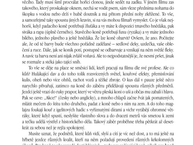 Druhá kniha Pavla Jahody se věnuje jedné z nejvděčnějších, ale také nejobtížnějších prací s koněm –, natáčení filmů. Čtenář se poutavou formou vyprávění zkušených filmařů-koňáků seznámí se spoustou nejroztodivnějších příběhů, patálií a historek, čímž se dozví množství potřebných informací o práci s koněm při filmovém natáčení. Kniha představí nejen přípravu tohoto zvířete na tuto náročnou práci, ale také pohled na věc z perspektivy samotného koně, po kterém jsou vyžadovány nejrůznější herecké výkony v uměle navozených podmínkách. Zábavné, obdivné a zároveň naučné vyprávění, které nabízí pohled do zákulisí filmové práce a v jednotlivých kapitolách vystupuje řada známých osobností filmového plátna, je doplněno o barevnou fotografickou přílohu.