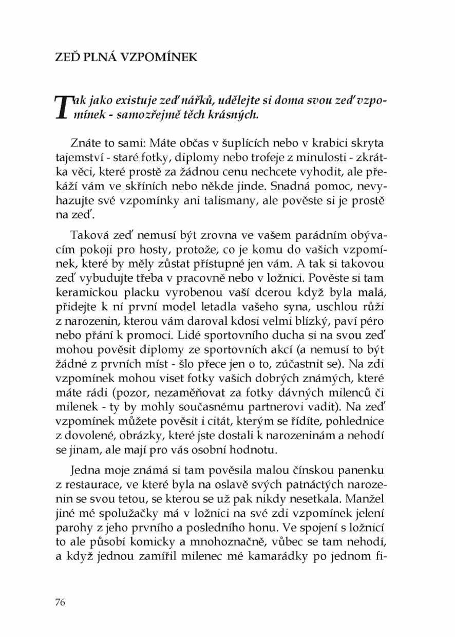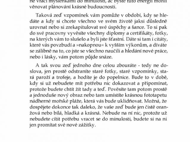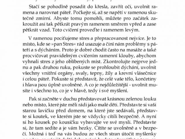 Na tyto a tři desítky podobných otázek nabízí autorka odpovědi podložené ověřenými zkušenostmi osobními i mnohých návštěvníků meditačních a relaxačních kurzů, které vede. Předkládá je formou srozumitelných minipříběhů, které většinou udiví tím, jak je to prosté – žít spokojeněji a pozitivně působit na své okolí. Stačí vědět jak na to. A k tomu vede čtenáře tato kniha vycházkovým krokem.