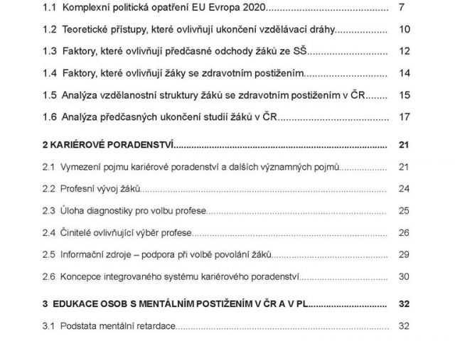 Odborná publikace s názvem „Komparace profesní orientace žáků s mentálním postižením“ se zabývá problematikou „kariérového poradenství“ u žáků s lehkým mentálním postižením na základních a středních školách v České republice a v Polsku. Práce je v mnoha ohledech důležitým počinem na poli speciální pedagogiky a srovnávací pedagogiky, protože zkoumá úroveň profesní přípravy a profesního uplatnění žáků s LMP na pozadí dvou rozdílných školských systémů, českého a polského. Teoretická část odborné publikace mapuje dosavadní analýzu předčasných ukončení studií žáků v ČR, kde podstatným problémem je předčasné ukončení studia na střední škole v oborech středního vzdělání s výučním listem kategorie E. Zde se vzdělávají převážně žáci s lehkým mentálním postižením. Podrobně se zabývá „kariérovým poradenstvím“ na školách a možnostmi edukace žáků s mentálním postižením (včetně rozdílného legislativního rámce) v České republice a v Polské republice.